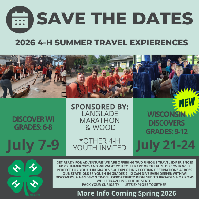 Get ready for adventure! We are offering two unique travel experiences for Summer 2026 and we want YOU to be part of the fun. Discover WI is perfect for youth in grades 6–8, exploring exciting destinations across our state. Older youth in grades 9–12 can dive even deeper with WI Discovers, a hands-on travel opportunity designed to broaden horizons while traveling out of state.